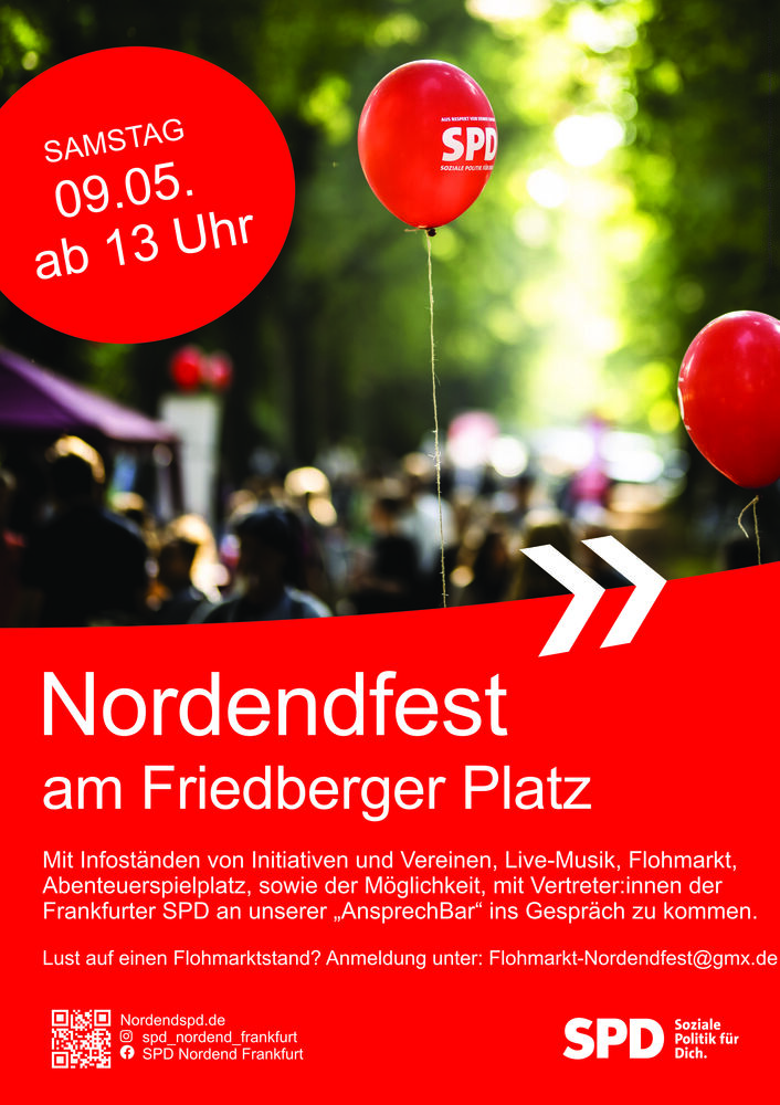 Das Nordendfest der SPD Ortsvereine geht in eine neue Runde und bald ist es soweit! Die Vorbereitungen laufen auf Hochtouren. Am Friedberger Platz bieten wir Live-Musik und politischen Statements von SPD- Politiker*innen eine Bühne, werden Infotische von Vereinen und Initaitven aufgebaut, wird unsere bewährte "AnsprechBar" allen Fragen, Anregungen und Gedanken von Mitbürger*innen rund um Lokalpolitik im Nordend Rede und Antwort stehen, wird der Abenteuerspielplatz genug Action für die Kleinen bieten und wird es natürlich eine Möglichkeit für ein geselliges Miteinander mit Essen und Trinken geben. Seien Sie herzlich eingeladen. Wir freuen uns drauf!